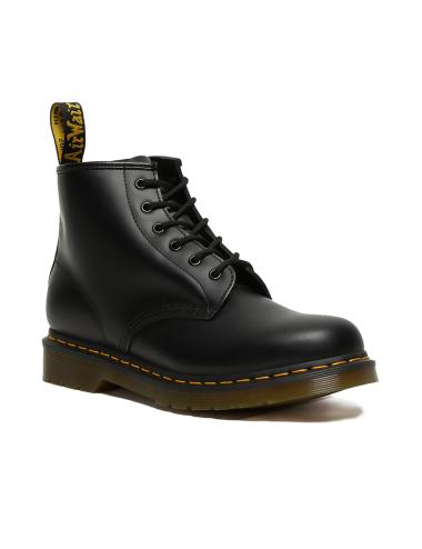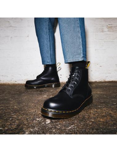 Dr Martens 101 YS 6-eyelet black matte laminated leather combat boots, black tubular laces, classic yellow stitching, rubber sole with Air System |