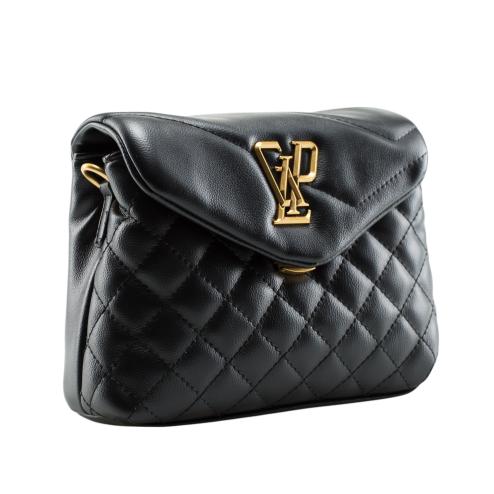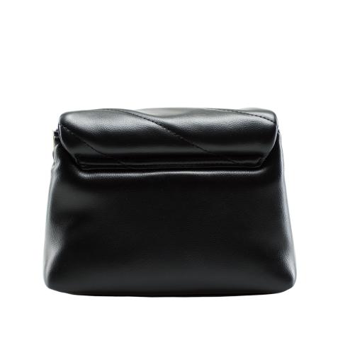 Women's handbag in black faux leather, closure with metal hook antique gold, inner pocket with zip closure, front logo lettering metal antique gold, inner lining in fabric, removable shoulder strap, accessories in antique gold metal.
