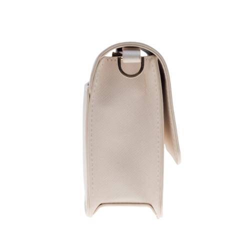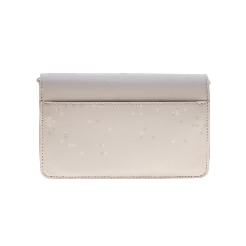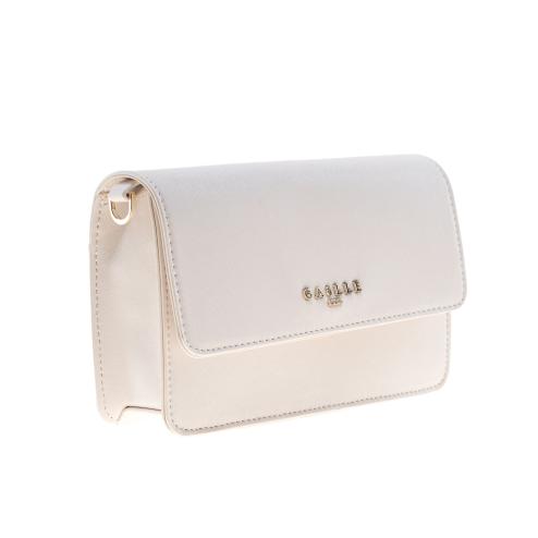 Women's small shoulder bag in ivory-coloured vegan eco-leather saffron effect, removable shoulder strap and adjustable tone, flap with automatic button closure, inner paper compartments, inner pocket with zip, front lettering logo in gold metal, inside in eco-leather.