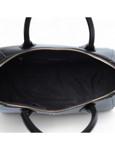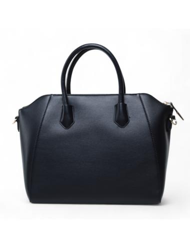 Black faux leather satchel bag with double handles and adjustable shoulder strap