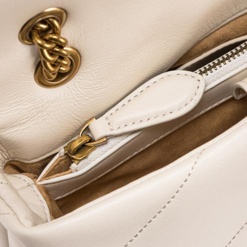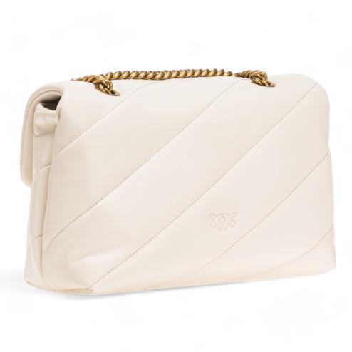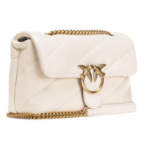 Pinko classic bag with shoulder strap, texture in soft silk white leather, iconic bronze metal buckle with birds Love Birds. Interior lined in ivory microfiber, central inner pocket with zip, bronze metal shoulder 110 cm long.