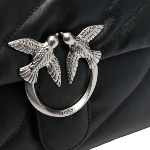 Women's soft black leather shoulder bag, iconic silver-coloured metal buckle with Love Birds. Interior lined in black microfiber, central inner pocket with zip, silver metal shoulder 110 cm long.