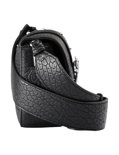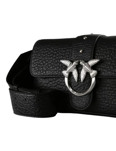 Black hammered leather mini bag with Love Birds logo and adjustable shoulder strap