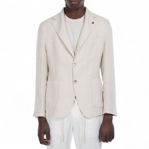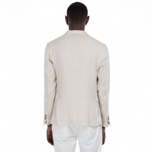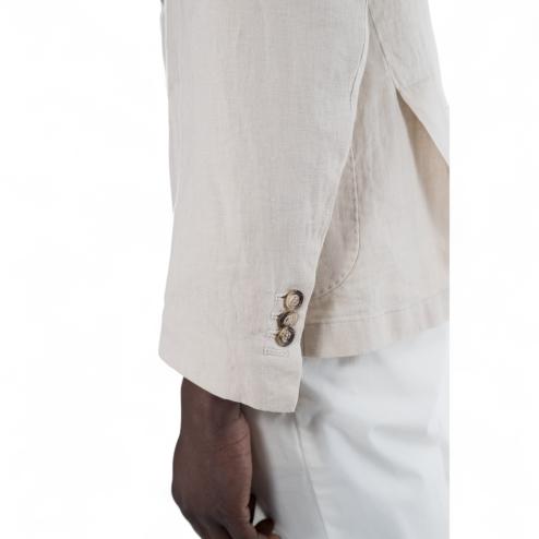 Men's beige linen jacket with two buttons, front pocket, inner pocket and sleeves lined.