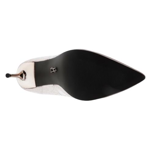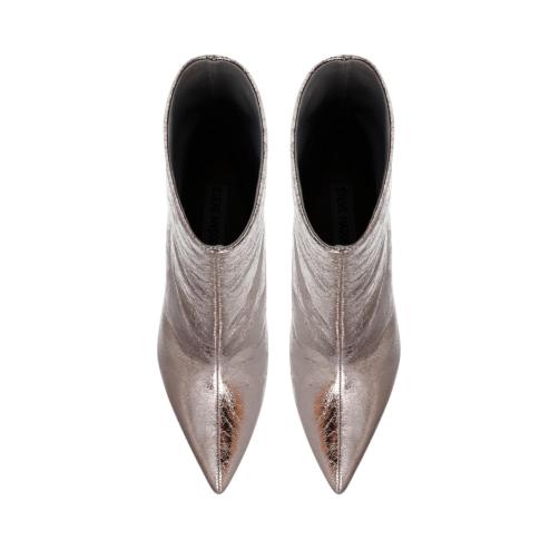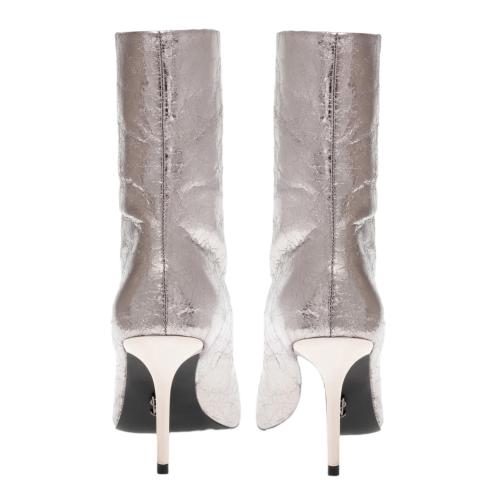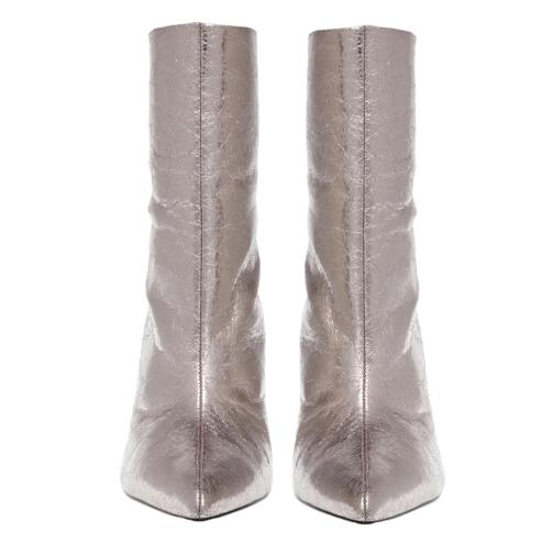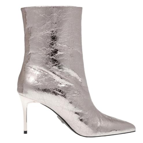 Women pointed ankle boots in silver color, glossy stiletto heel 8,5 cm high.