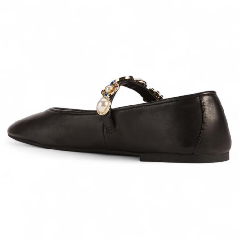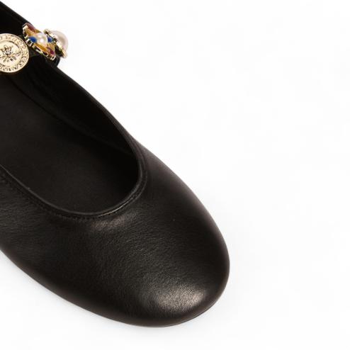 Round toe flat shoes in soft black leather, instep band with multicoloured and gold silver-coloured appliqués and adjustable buckle fastening, insole padded inside covered in leather, with non-slip rubber sole.