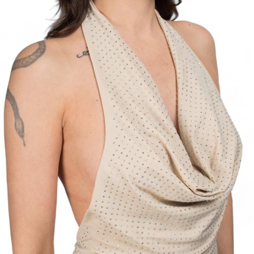 The adhering beige tube, with a short cut, has a neckline on the back embellished with bright stones, creating an harmonious union of elegance and sensuality. This garment is ideal for special evenings or glamorous events, thanks to its refined design that captures attention and adds a touch of light to the overall look.