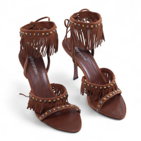 Elegant and gritty, the brownsandals Jeffrey Campbell Saige represent a perfect mix between boho style and strong character. Made of brown suede, they stand out for the upper embellished with decorative fringes and studs in bronze and lead tones, which give a rock-chic touch.