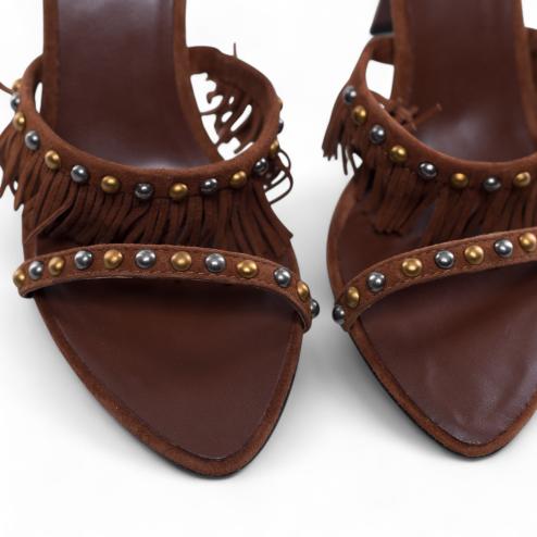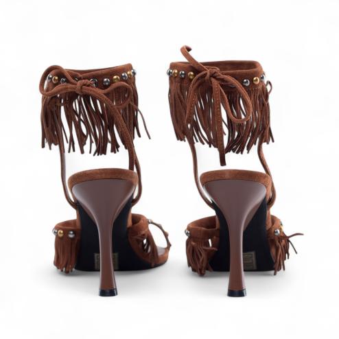 Brown sandals in suede leather, upper with fringes and application studs color bronze and lead, ankle closure with adjustable lace, insole padded, 10 cm high stiletto heel, rubber sole, tapered tip.