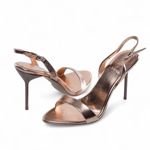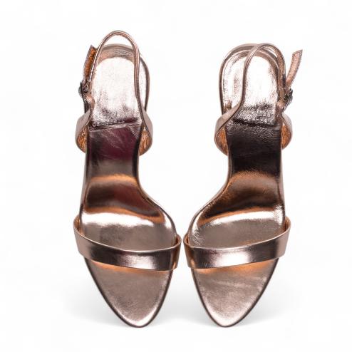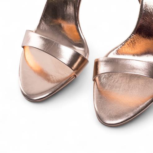 Rose Gold Laminated Leather Sandals, Adjustable Ankle Clasp, insole in padded leather, 10 cm high stiletto heel, rubber sole, tapered tip.