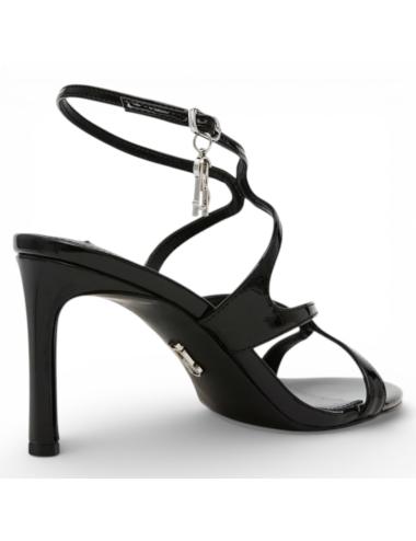The black patent leather upper creates a premium glossy finish. Thin crisscross straps enhance the foot, while the ankle strap with logo charm adds a distinctive brand detail. The open structure ensures visual lightness and feminine fit.