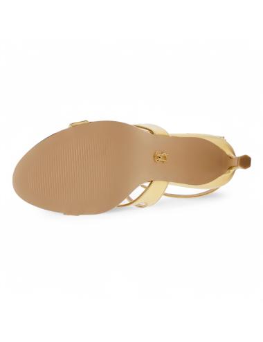 Women's elegant leather sandals in gold color with glossy finish, adjustable ankle strap, 9 cm high stiletto heel, insole padded interior.