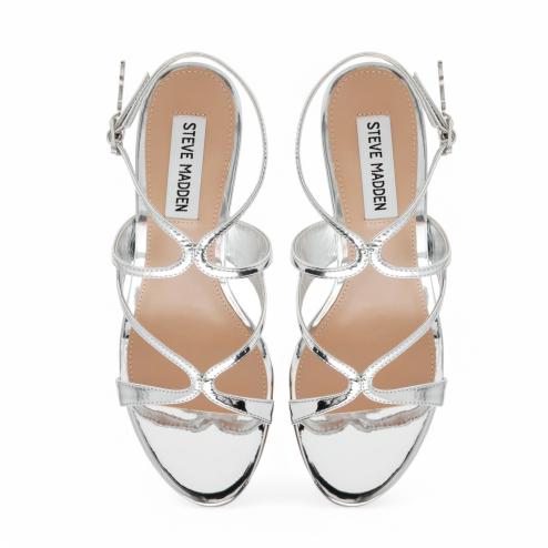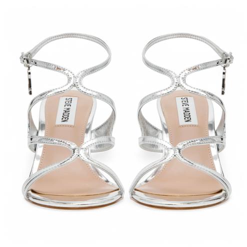 Sandals Steve Madden Gracia silver are the perfect choice for a sophisticated and glamorous look. Made of silver-plated eco-leather with a refined glossy finish, the silhouette opens thanks to their 9 cm stiletto heel. The adjustable ankle strap ensures a stable and comfortable fit, while the insole padded interior offers maximum comfort.