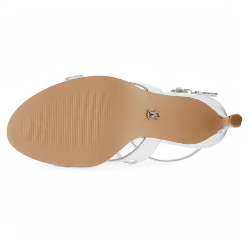 Elegant women's leather sandals in silver color with glossy finish, adjustable ankle strap, 9 cm high stiletto heel, insole padded interior.