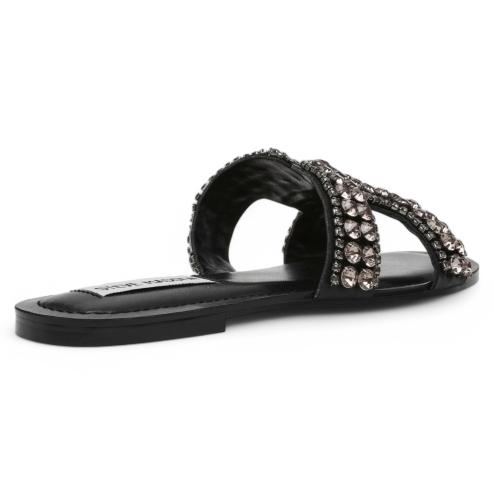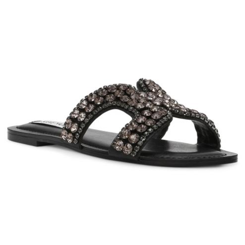Elegance and comfort meet in the low sandals Zaira by Steve Madden. This women's slippers model is made of soft black leather and embellished by an elegant application of bright stones on the upper band, which adds a touch of light and refinement to the look. The insole padded interior offers a comfortable fit, ideal to accompany you throughout the day. Perfect for informal occasions but also for more chic outfits, these sandals combine practicality and style in one essential accessory for the summer season.