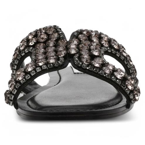 Women's low sandals model slippers in black leather, application light stones, insole padded interior.