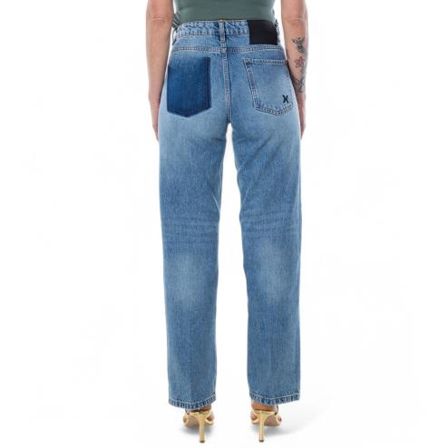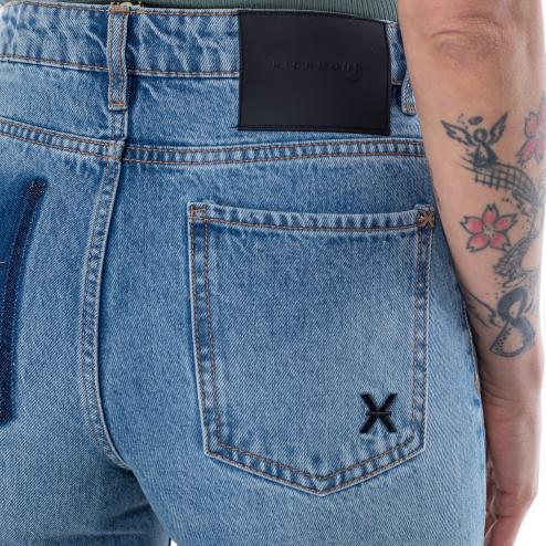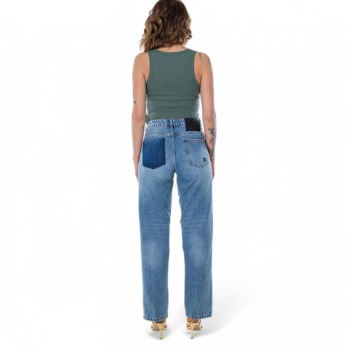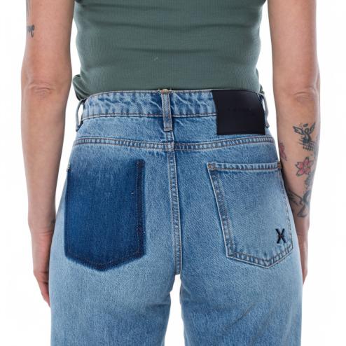 Womamn denim with pocket torn on the back belt loops, black leather logate flap, zipper closure and a logated button.