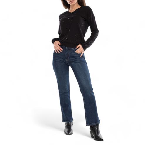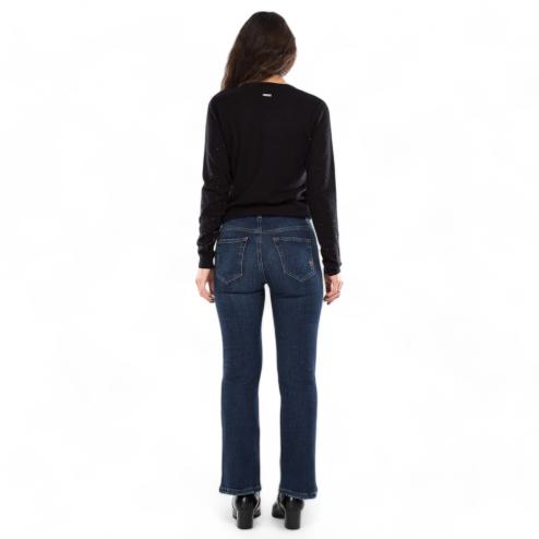 Jeans 5 pockets regular waist slim leg slightly flanked at the bottom ankle length, zipper closure and metal visible button.
