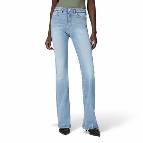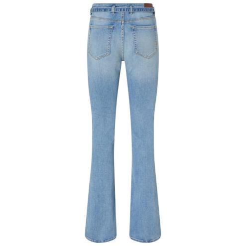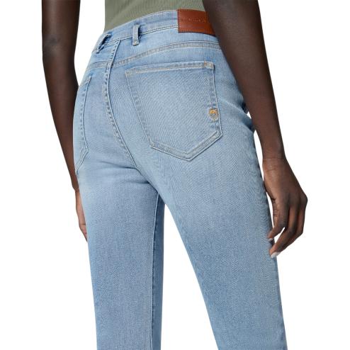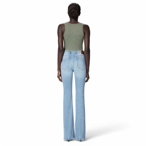 Five women's pockets in stretch denim with light vintage washing, characterized by high waist and tight fit to the knee, and then open in an elegant silhouette of elephant leg. The design is embellished with a thin belt coordinated in denim, complemented by a mini metal buckle with the Love Birds Diamond Cut logo. The closure with metal nail button and covered zip ensures an impeccable finish. A versatile and timeless garment, perfect for any occasion and matchable to any style.