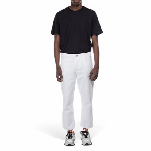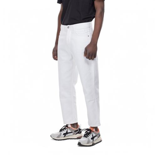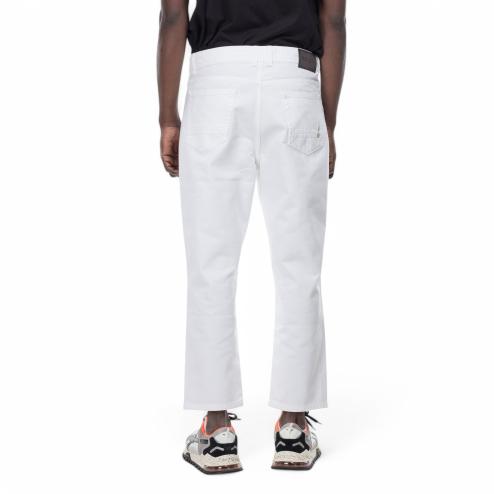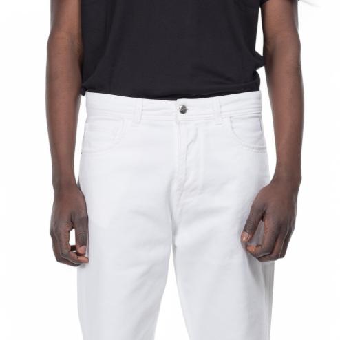 Men's denim jeans in white, featuring a classic 5-pocket design. These jeans include belt loops and a leather braid detail on the back, adding a touch of sophistication. The closure is secured with metal buttons, while the soft, flexible fabric offers comfort throughout the day. The leg tapers toward the bottom, giving these jeans a modern, slim fit that enhances the overall silhouette. Perfect for casual or semi-formal outfits, these jeans combine timeless style with a contemporary edge, making them a versatile addition to any wardrobe.