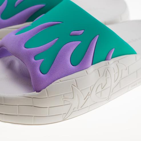 Acupuncture rubber sandals, green rubber upper and flame pattern in purple fabric, interior lined in purple fabric, sole in resistant plastic material.