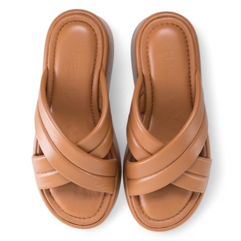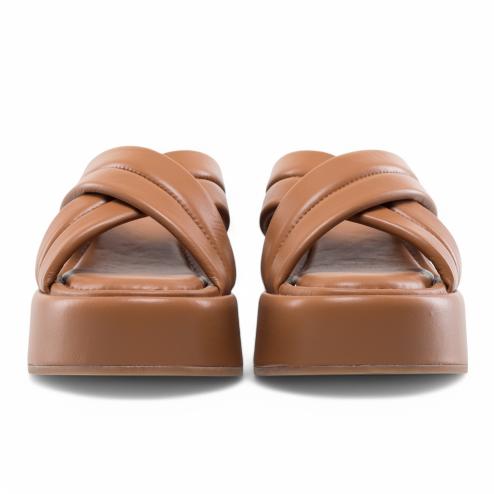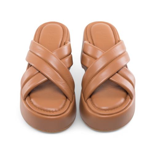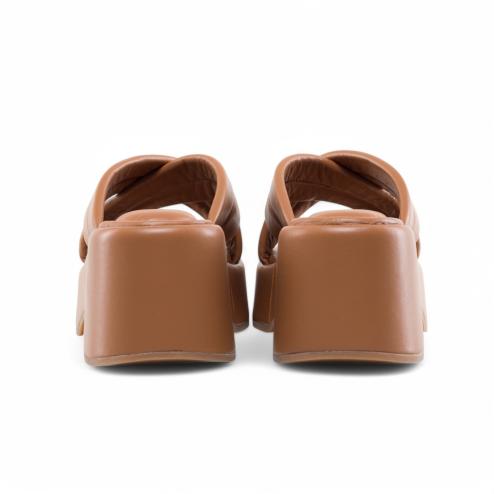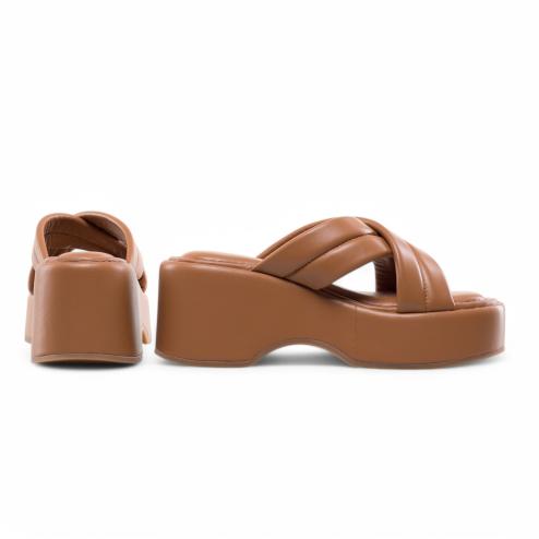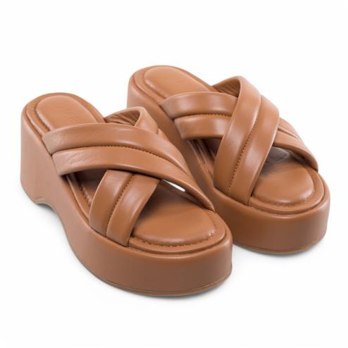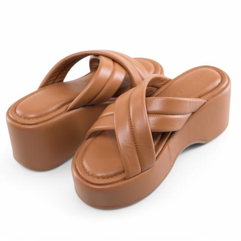 Upper with intersection bands in soft cognac padded tassel, high platformer front 4 cm and back 8 cm, insole in soft latex covered in leather, non-slip natural rubber sole.