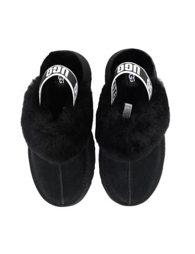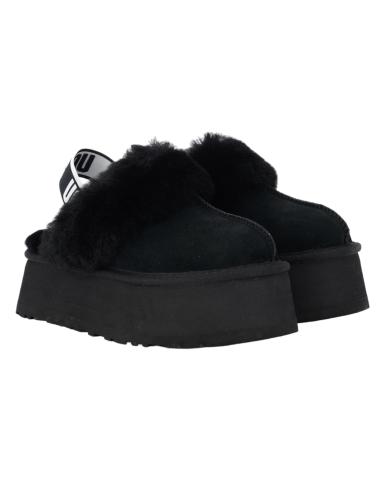 UGG Funkette black women platform slippers made of natural sheepskin, with a 6 cm high non-slip lightweight rubber sole, black and white logo elastic at the heel, and black sheepskin interior.