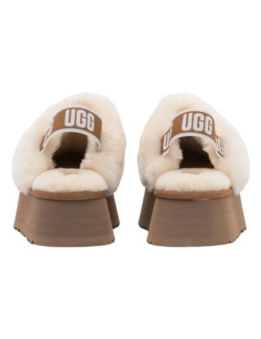 UGG Funkette chestnut women platform slippers made of natural sheepskin, with a 6 cm high non-slip lightweight rubber sole, brown and white logo elastic at the heel, and white sheepskin interior.