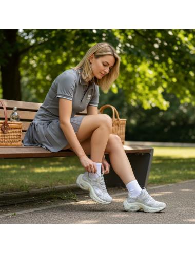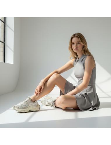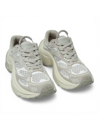 The leather and technical mesh upper in gray and white shades creates a modern and light material mix, enhanced by perforated inserts that improve breathability. The dynamic and structured design gives character and makes the sneaker the protagonist of the outfit.
