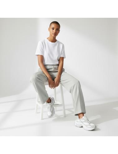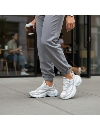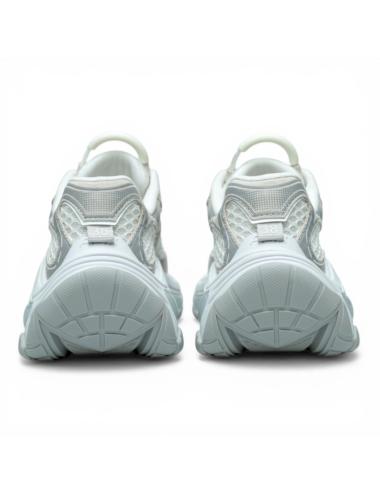 The leather and technical mesh upper in icy white tones creates a clean and modern effect, enriched with perforated inserts that improve breathability. The structured and dynamic design enhances the silhouette, making the shoe the protagonist of the look.