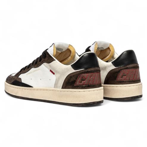 The two-tone upper combines white and brown with black trim, enhanced by sophisticated details like the embroidered logo on the heel. The vintage-effect rubber sole ensures stability and durability, maintaining a timeless style.