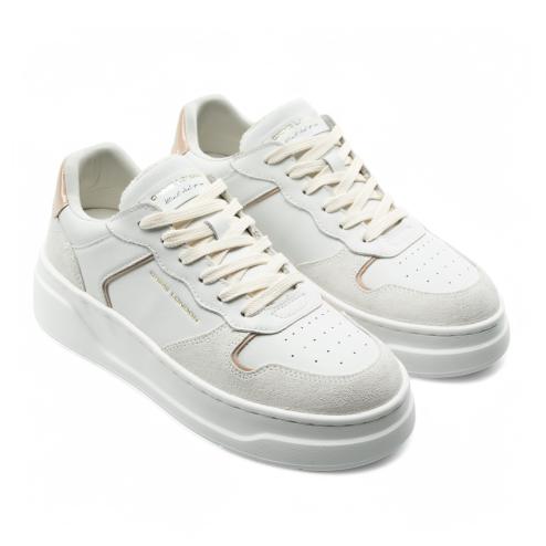 Sneakers platformer for women, high quality white leather upper, 4 cm high ultra light rubber sewn, details on the heel in soft pink leather, suede leather inserts, insole inside in raised latex 2,5 cm covered in leather, white cotton laces.