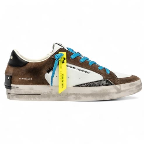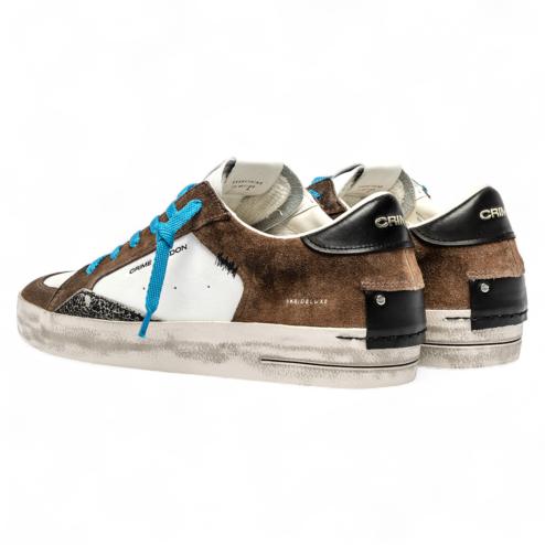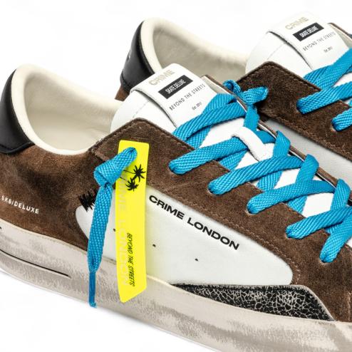 The Crime London SK8 Deluxe Cocoa Mist are handcrafted sneakers Made in Italy, crafted from a combination of brown suede and black crackle inserts for a bold, contemporary look. The black leather heel tab and white leather tongue with a leather logo label enhance the urban design.
