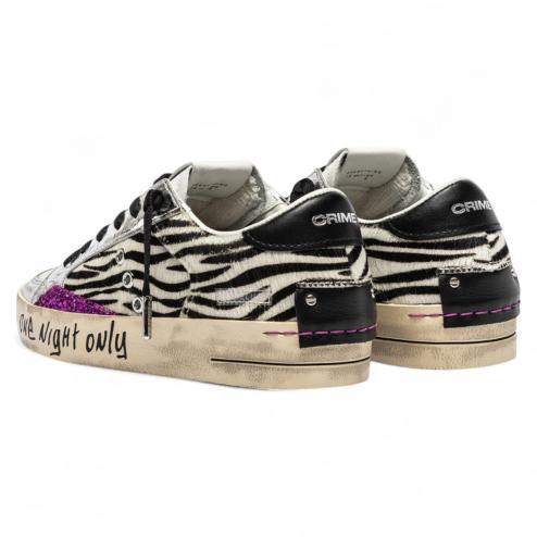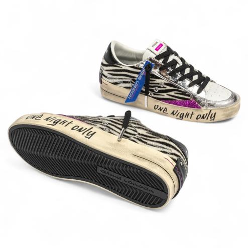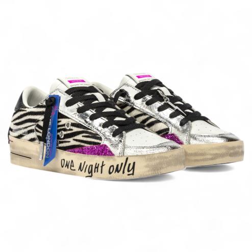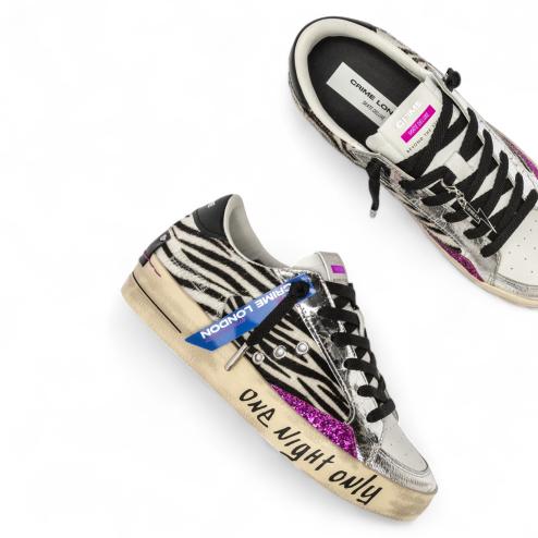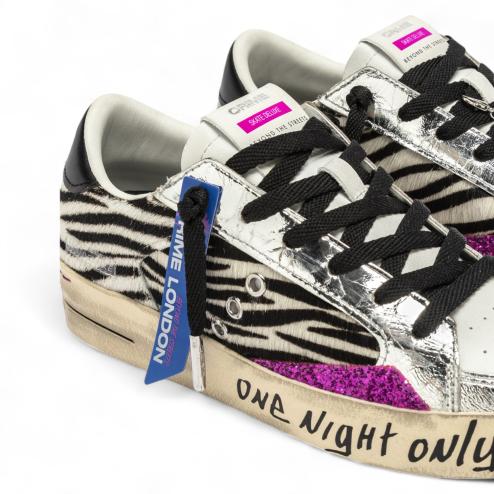 The SK8 Deluxe Disco Heat is bursting with style and attitude. Featuring a zebra-print upper with silver laminated leather details and fuchsia glitter inserts, these sneakers celebrate the boldest, most nocturnal spirit.