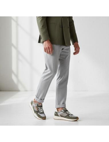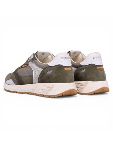 Upper combines leather and fabric in olive green and taupe tones, enriched with light gray suede details that create depth and contrast. White leather heel tab, the taupe fabric tongue with logo label and the orange side insert give the sneaker a dynamic and contemporary aesthetic.