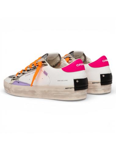 White leather upper is enhanced by lilac foil details and zebra inserts. Fuchsia suede heel tab, the silver glitter tongue with leather logo label and the black leather back patch push the fashion look. The double fluorescent orange and white lace allows for high-impact styling. The only iridescent tag signs the Crime London aesthetic.