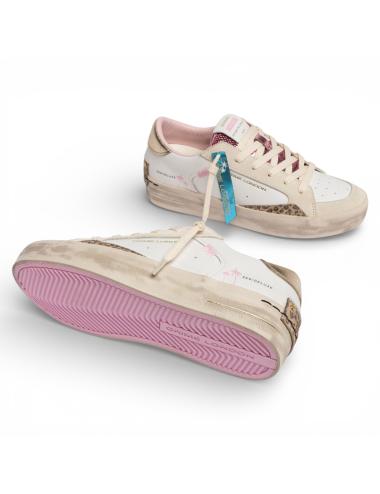 White leather upper is enriched with leopard suede details for a contemporary animal twist. The platinum foil heel tab, the pink sequin tongue with leather logo label and the leopard suede back patch push the fashion identity. Marshmallow laces soften the look, while the unique turquoise mirrored tag signs the model.