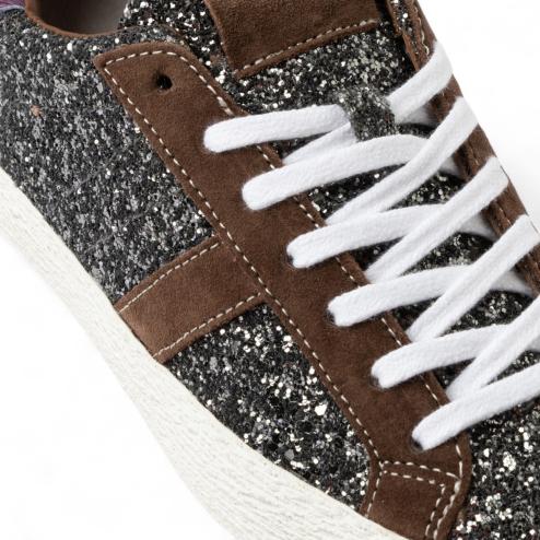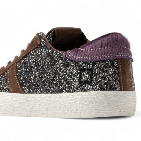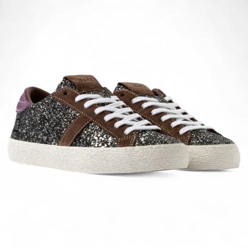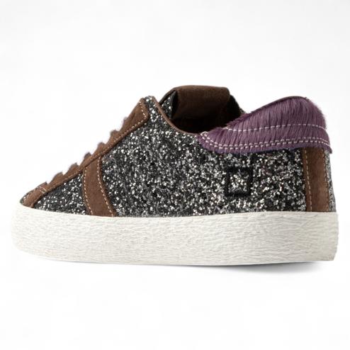 The Hill Low Glitter Metalgun are sneakers designed for those who love to shine without sacrificing boldness. The gunmetal glitter upper creates a sophisticated and bold metallic effect, enhanced by suede patches embossed with the word DATE .
