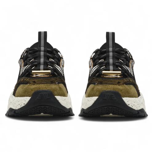 Women's chunky trainers with a technical fabric upper, olive green suede inserts and animal zebra and tiger details. Sole thick oversized white with black spots and black non-slip rubber tread, lace-up closure and pull-tab for a quick fit
