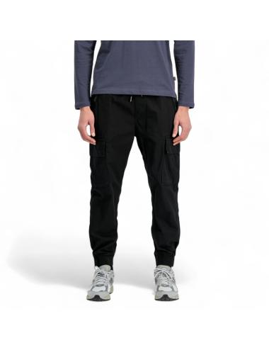 Black men's cargo trousers, back pocket with zip closure, side pockets with zips, side pockets on the legs with clip closure, elasticated waist and bottom of the leg, adjustable drawstrings at the waist.