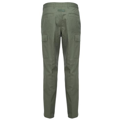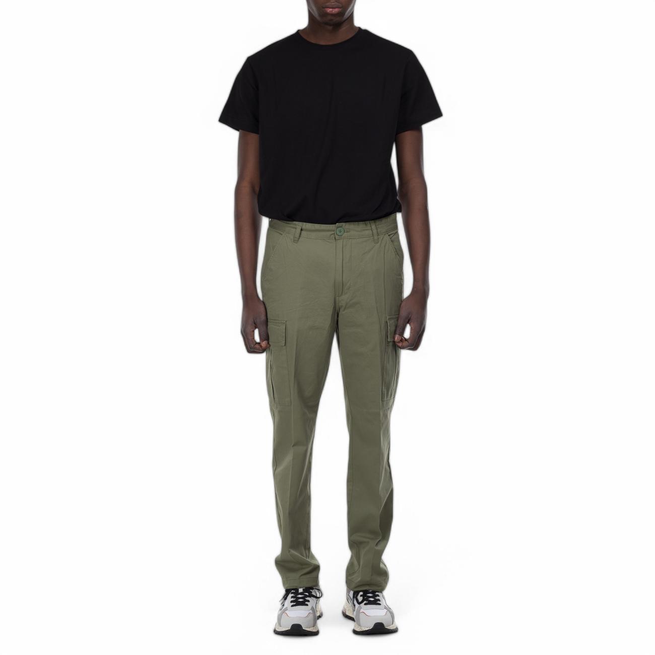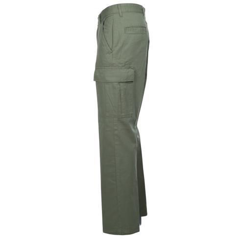 Military green cotton fabric trousers, cargo model with soft leg side pockets.