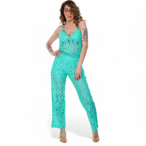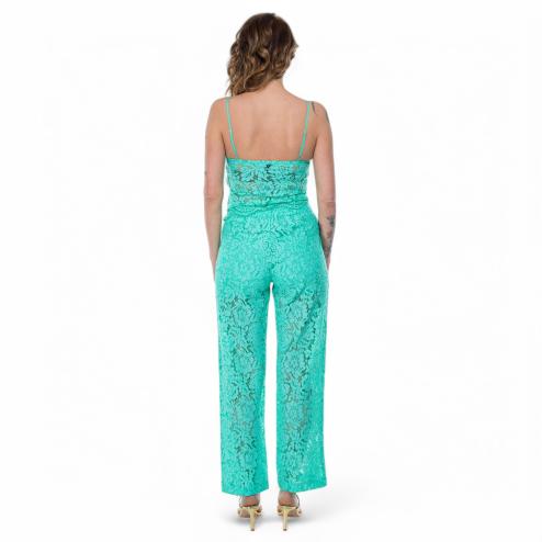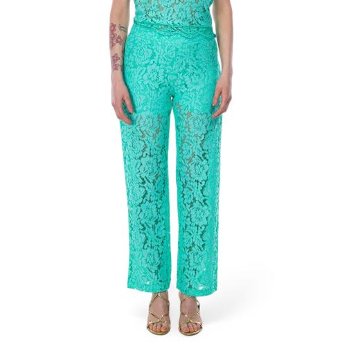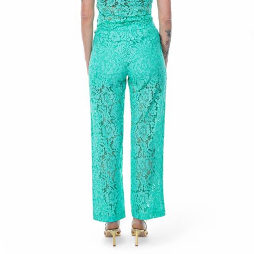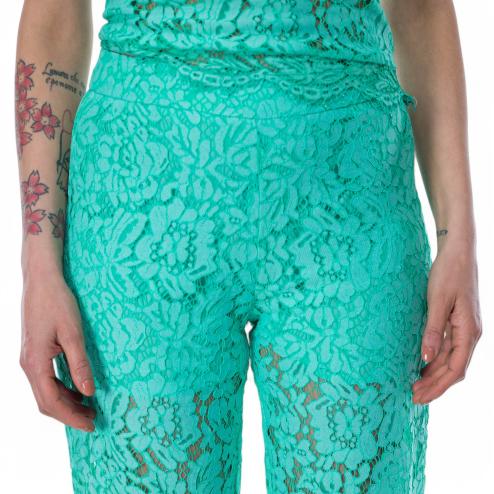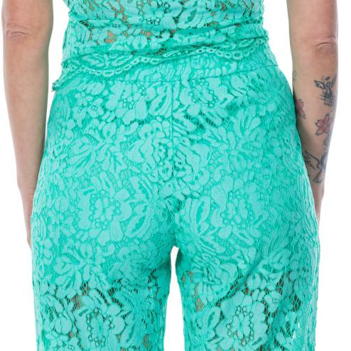 Green lace trousers with butts and transparent bottom: sensual, elegant and trendy. Perfect for bold and refined look. Comfort and style in an irresistible fashion garment.