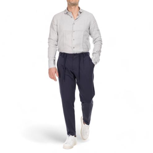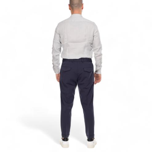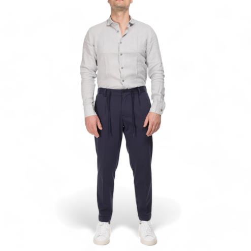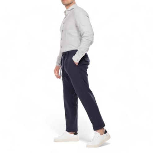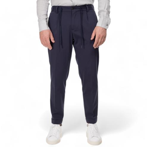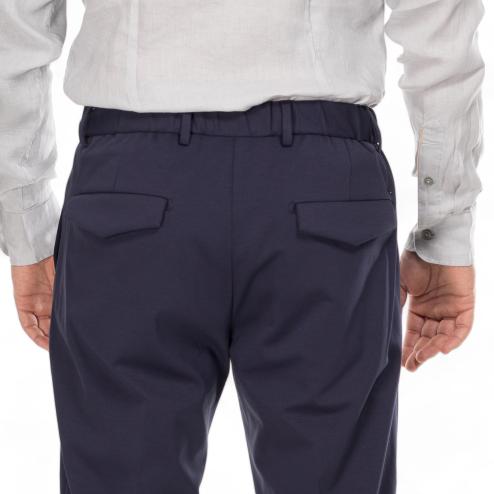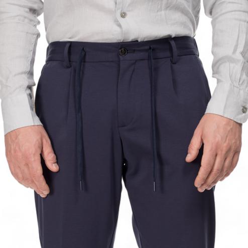 Outfit man chinos pants blue navy color, thread pockets closure with visible button and concealed zipper and rope laces, elastic waist, soft leg, 2 pockets on the back with flap.