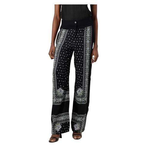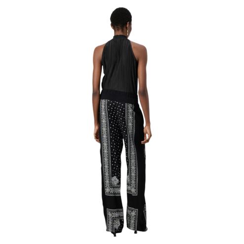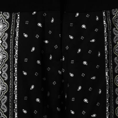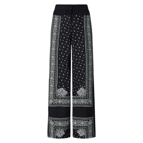 Long wide-leg elegant trousers in viscose twill fluid with all-over bandana print, combined with a top in monocolor viscose georgettes for a refined contrast. The waist with elastic and belt loops, the relaxed horse and the wide and straight leg enhance the lightness of the fabric, offering comfort and movement at these elegant trousers Completed with a zip closure and button in life, these printed pants are ideal for a summer look with an effortless chic charm, perfect with a short sleeve t-shirt for a casual elegance.