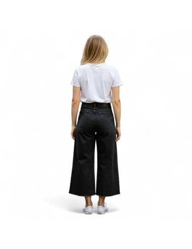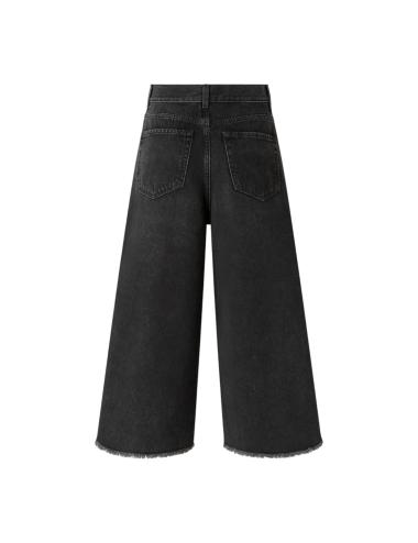 Long five-pocket jeans with a '70s-inspired cut, featuring a wide leg with a frayed hem and a mid-rise. Crafted from black cotton denim, stonewashed and sanded for an authentic and modern distressed look.