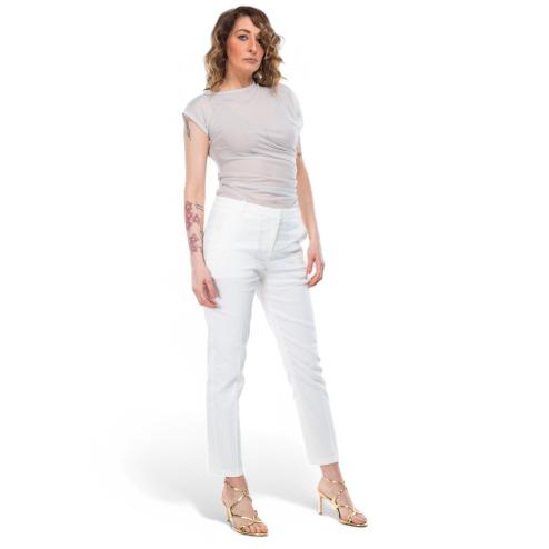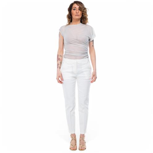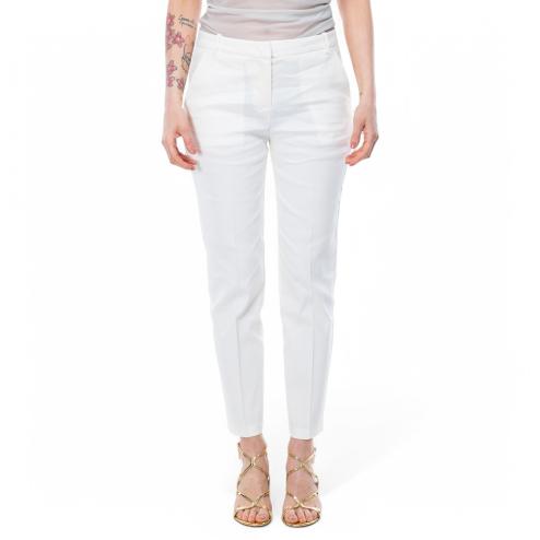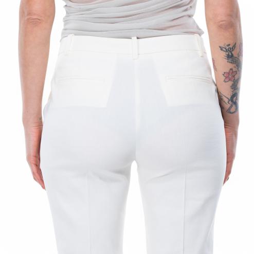 Cigare-fit white trousers in stretch linen with regular waist and belt loops. They have French front pockets and a thread on the back, with fold detail in the middle of the leg both in front and in the back. Zip closure and small hook for impeccable fit.