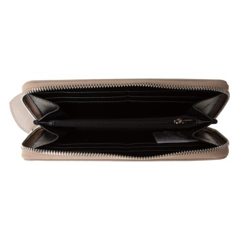 Wallet in crocodile print concrete beige vegan eco-leather, silver metal zip closure, internal pocket with zip closure, internal compartments, black vegan eco-leather interior.