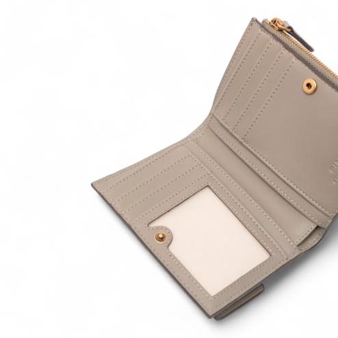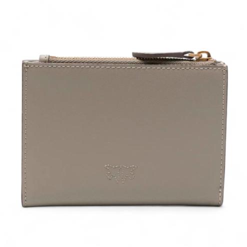 Women's wallet in grey leather, iconic Love Birds logo in bronze metal, interior lined in ivory polycotton, internal card slots, zip compartment, coin compartment with clip closure.