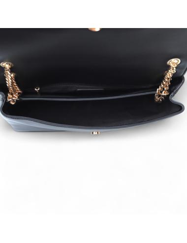 La Gaëlle Shoulder Bag Chain è la borsa ideale per chi desidera coniugare eleganza e praticità. Realizzata in pregiata ecopelle nera, presenta un design strutturato e raffinato, impreziosito dal logo frontale in metallo e dalla tracolla con catena dorata che aggiunge un tocco di luce e femminilità.