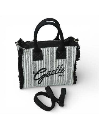 Realizzata in tessuto poliestere con lavorazione a righe e logo GAËLLE ricamato a contrasto sul frontale, combina texture materica e branding evidente. Doppi manici superiori per portabilità a mano e tracolla rimovibile.